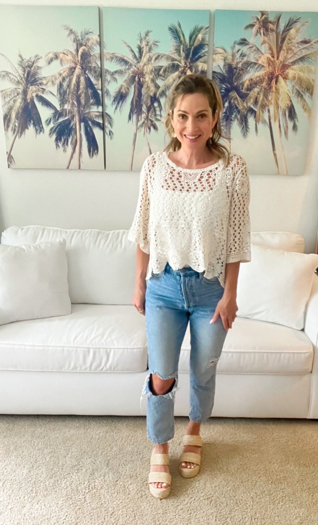 Look #3: Cream Crochet Top (not mine but similar), Platform Beach Sandal